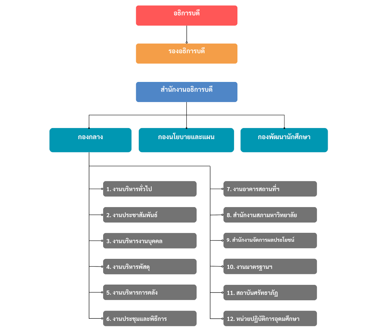 และต่อมาเมื่อวันที่ 17 ธันวาคม 2561 ได้มีประกาศมหาวิทยาลัย เรื่อง การจัดตั้งส่วนงานภายใน งานมาตรฐานและประกันคุณภาพ การศึกษา มีฐานะเทียบเท่าระดับงาน สังกัดกองกลาง สำนักงานอธิการบดี มีสายการบังคับบัญชาขึ้นตรงต่อรองอธิการบดี หรือผู้ช่วยอธิการบดีที่อธิการบดีมอบหมาย และวันที่ 20 กุมภาพันธ์ 2566 ได้มีประกาศมหาวิทยาลัย หน่วยปฏิบัติการอุดมศึกษา วิทยาศาสตร์ วิจัยและนวัตกรรม ทำให้ในปัจจุบัน กองกลาง สำนักงานอธิการบดี มีหน่วยงาน ภายในทั้งหมด จำนวน 12 งาน ดังนี้