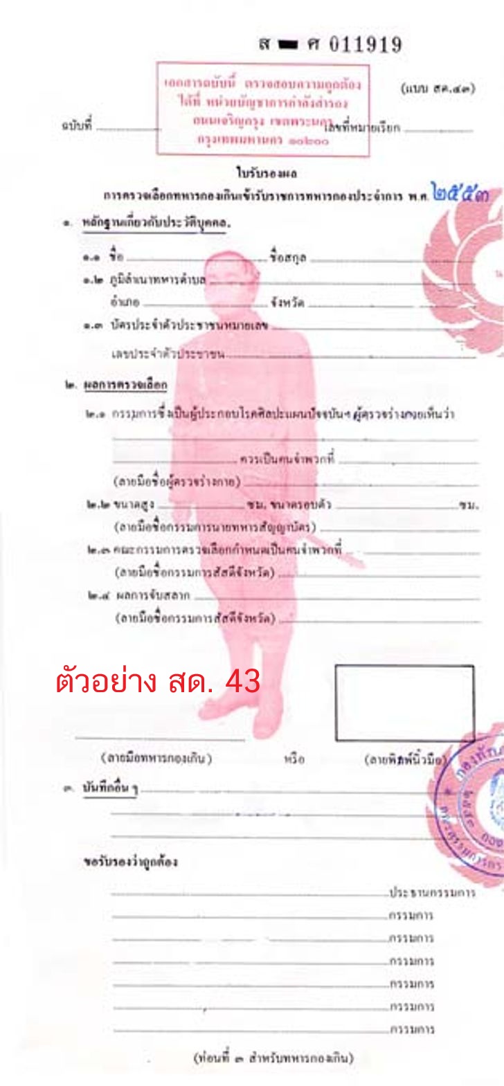 2. หลักฐานทางทหาร สด.43 คือ ใบรับรองผลการตรวจเลือกทหาร หรือ “ใบผ่านการเกณฑ์ทหาร” เป็นหลักฐานแสดงว่าได้ผ่านการเกณฑ์ทหารมาแล้ว และจะต้องระบุผลการตรวจเลือกแล้วเสร็จ เช่น ไม่ต้องรับราชการ, หรือจับสลากได้ใบดำ