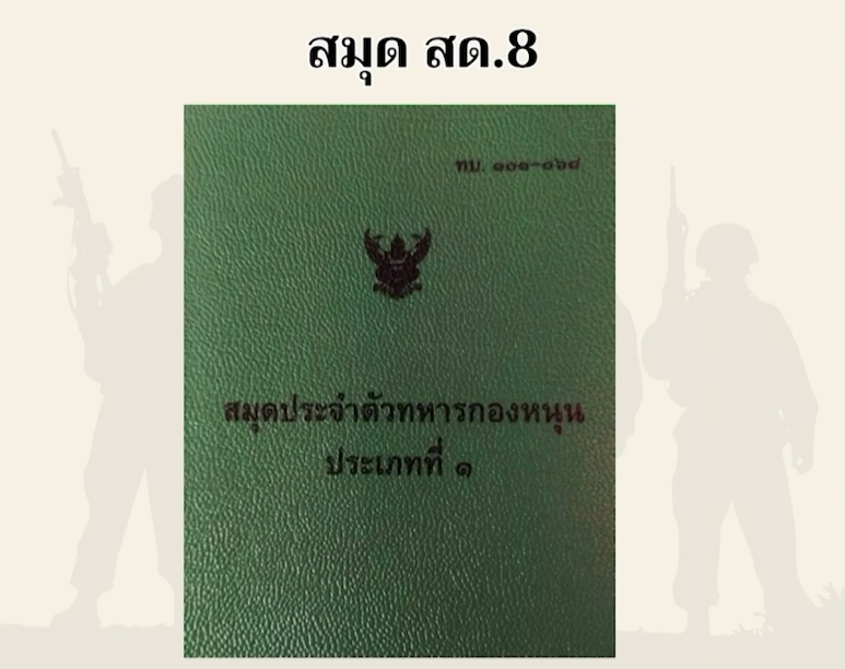 1.หลักฐานทางทหาร สด.8 คือ สมุดประจำตัวของทหารกองหนุนที่ผ่านการเป็นทหารกองประจำการมาแล้ว รวมทั้งผู้ที่สำเร็จการศึกษาวิชาทหารชั้นปีที่ 3 (รด.) เป็นหนังสือสำคัญที่ติดมาพร้อมกับสมุดประจำตัวทหารกองหนุนประเภทที่ 1 ซึ่งจะได้รับ สด.8 เมื่อรับราชการทหารกองประจำการ (คือเป็นทหารเกณฑ) จนครบกำหนดปลด
